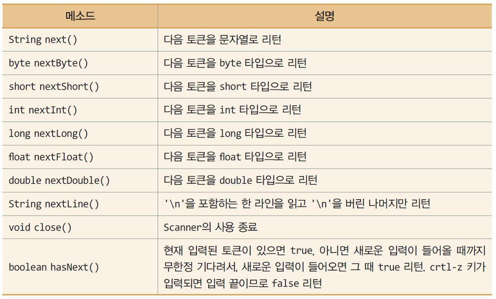 | String next() | 입력받은 값을 문자열 타입으로 반환한다. |
