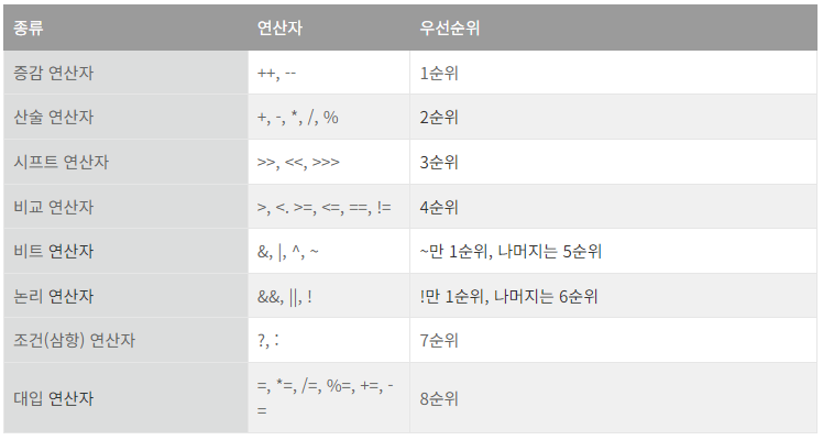 - 연산자는 우선순위가 높은 연산자를 먼저 처리한다.